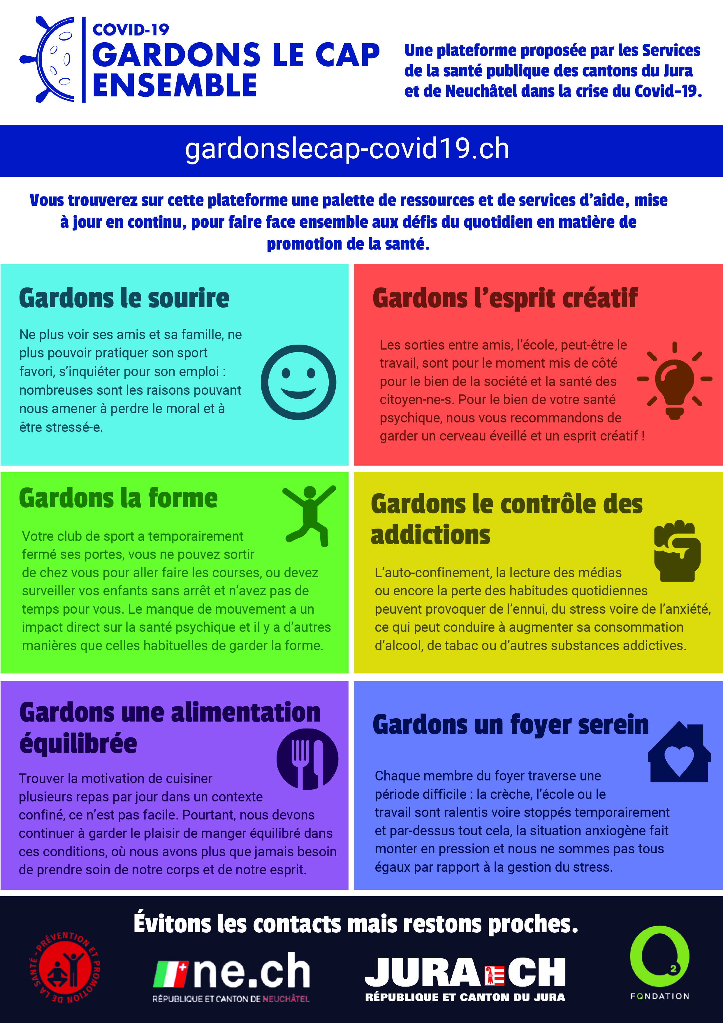 Les services de santé publique des cantons du Jura et Neuchâtel s’unissent pour mettre en place une plateforme commune qui regroupe différentes ressources pour faire face ensemble aux défis du quotidien en matière de promotion de la santé :
